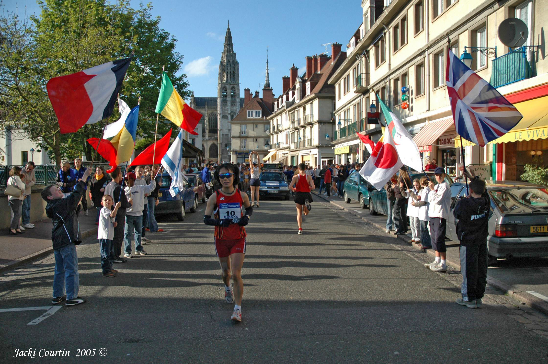 昨年のこのレースで2位入賞したことから、「リベンジをしておいで。」と再びフランス・ノルマンディーでの4日間連続6レース合計90キロを走るツールのレースに派遣していただいた。日本選手団は団長と選手3名、ランナー3名とも再派遣のメンバーである。今年は夏に広島〜長崎間を走る反核平和マラソンにフランスから7名を迎えるという重要な年の交流となっている。 フランス到着は5/1、ゴールデンウィークに入って急に気温の上がった日本から移動していったが、パリも同じく暑さを感じるくらいだった。すぐに迎えのスタッフ方々と合流でき、送迎のバスに乗り込む。早速昨年も参加していたランナーたちに出会い、「ヒロコ、ヨク来タネ。」と再会を喜び合い、お互いの近況を報告しあう。とても緊張していたにもかかわらず時差ぼけで眠りこけてしまった初参加の昨年とは異なり、最初からハイテンション。 北西に進路を取ること約2時間半余り、ノルマンディーの牧場地帯の中に築100年は経っているという石造りの3階建ての宿舎に到着した。ここがレース終了まで1週間の滞在拠点となる。細いせせらぎをはさんで向かいには小高い丘。空気は澄んで日差しは強くまぶしいくらい。2段ベットや3ベットルームなどユースホステル風の宿舎で1階が食堂、2階と3階が居室になっていて、2階には共同のシャワーが2箇所のみだが、3階に与えられたわたしたちの居室にはちゃんとシャワーがついていた。日中は暖かいが、陽が落ちると急に冷えこんで寒暖の差が大きい。 レースまでの間、午前中は体調管理のためのフリータイム、自由にジョギングに出かけたりして過ごす。午後には主催者側の手配で近くの観光や工場見学など。わたしたちを招待してくれているフランスのスポーツ連盟・FSGTはフランスの大手自動車メーカー・ルノーの労働組合が母体となったスポーツ組織が発祥とのことから、ルノーの工場を見学に行った。ちょっと堅苦しい見学ツアーだったが他国のランナーたちも一緒、「見学ガ終ワッタラドノ車ヲオ土産ニクレルノカナア。」「陸ツヅキダッタ乗ッテ帰レルケド、私タチハ海ヲドウヤッテ渡ロウカシラ。」「海底トンネルダヨ。」などと適当に冗談話をしながら工場内を廻ったりしていた。 ![]() 3日の開会式を経て、レースは4日の午後6時、15.6キロを走る第1ステージから始まった。各国からのランナーが国旗を持つ子供たちの先導で紹介され、日本の国旗を持ってくれているのは昨年から日本選手団のファンであるというマリーちゃん。「JAPAN・OGAWAがんばって・まり」とひら仮名交じりの手描きのTシャツで応援してくれる。日本を出る前には多忙で体調が悪く、「12時間も飛行機に乗っていたらエコノミー症候群で死んでしまうのでは?」とこのわたしが心配していたのだが、走り終えてびっくり、昨年よりも20秒ほど早いタイムでゴールしていた。初戦を意識しすぎて最初から突っ込みすぎた昨年のレースの反省から、5.2キロのコースを3周回廻る中でイーブンベースを心がけたことと、涼しいめの気候が幸いしたようだ。調子を整えて練習することが出来ないままここにやってきたが、自分のペースを守ればレースは出来ることを確信したわたしは初戦で2位につけていた。 2日目は午前中にハーフマラソン+午後にスーパーフラットの10キロと一番ハードな日程。レースの流れを決める大事な一日だ。昨夕の一戦でもうすでに脚はパンパン。アップをしていてもジョギング以上のスピードで走れそうにない。それでも走らなくてはならないハーフのレースは10時スタートで大きなアップダウンのある牧場地帯のコースを2周する。どう見てもわたしの今の力では1時間32分が順当なところ、今日もイーブンペースを心がけた。女子トップを見送り、順当過ぎるほど順当な走りで目標どおりのタイムでゴール。トップとの差は3分に開いた。 宿に帰ってランチビールが適当にまわってうとうとと小休止を取る。ここでぐっすり寝入ってしまうと筋肉が緩みすぎてしまうので、ベッドの上で横にはなっているけれどもお互い何かしゃべりあったりして適度なまどろみを保っている。トップとの差が更に開いたところで、いつも声をかけてもらうスタッフのオリビエからもアドバイスを受けた〜「ヒロコ、ガンバッテイルケレドモ女子トップノヴァレリーハ過去ニコノレースデ優勝争イヲ何度モシテイル実力アルランナーダヨ。チョット勝チ目ハナイカモネ・・・彼女モ40才代ダケドネ。」「エエ、一緒ニ走ルナカデ彼女ノ走力ハヨクワカルワ。ワタシハ自分ノベストヲ尽クスダケネ。」 次のレースは19時スタートの10K。日差しはまだまだ明るく、日本の感覚で昼下がりくらい。レースの会場も移動して、また新たな気持ちでアップをするのだがやはり脚はパンパン。とても流しどころではない。いつも声を掛け合う男子選手らと「Good Luck!」と健闘を祈りあいスタート地点に着くと、ちょうど女子トップのヴァレリーを確認す